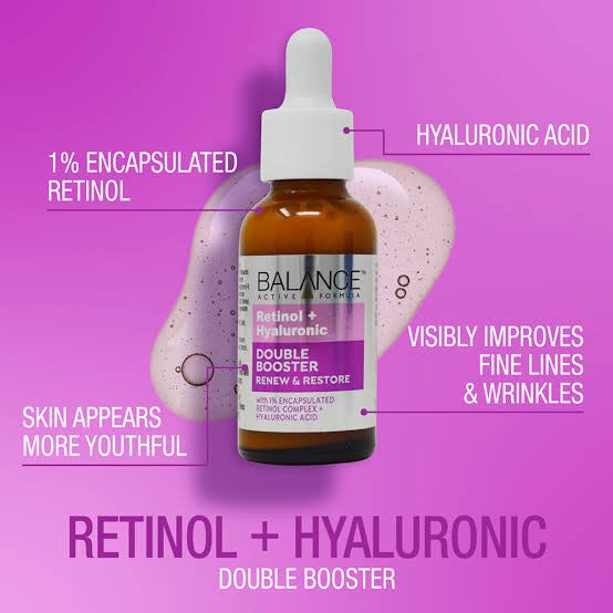 Balance Active Formula Retinol + Hyaluronic Double Booster is formulated with 1% encapsulated retinol complex. The retinol active is time released which is a more gentle and effective way of delivering this into the skin. Retinol is a pure form of vitamin A, known to visibly redue fine lines and wrinkles. Leaving the skin looking firmer, renewed and more youthful. Paired with Hyaluronic Acid for a boost of hydration.
